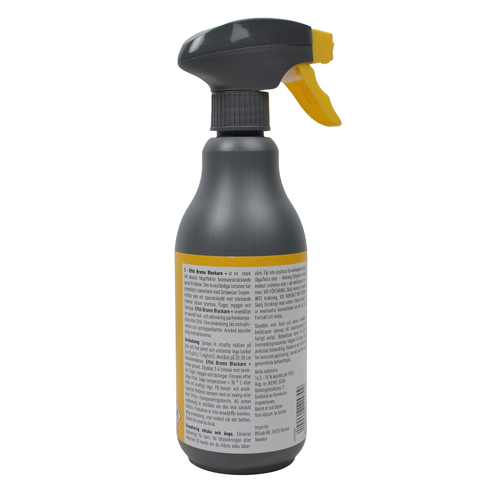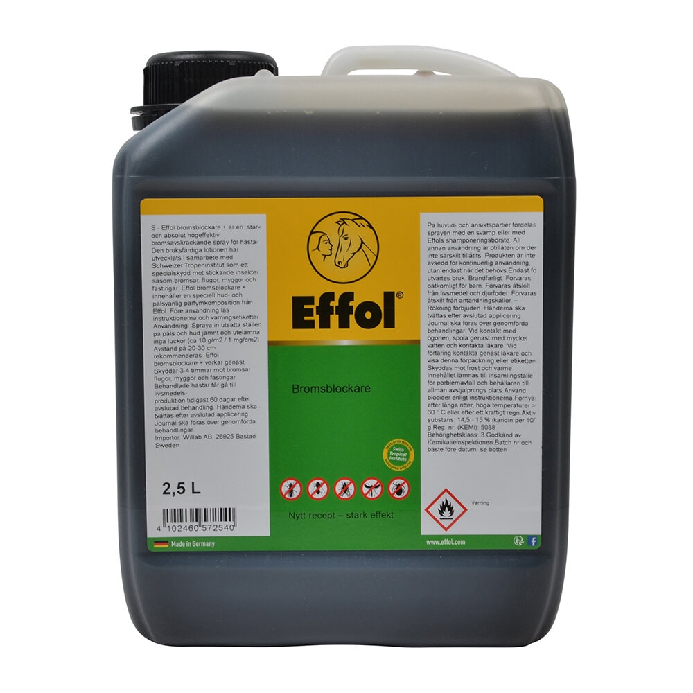 Effol broms blockare är en högeffektiv och dermatologiskt testad insektsspray / flugmedel. Den bruksfärdiga lotionen har tagits fram i samarbete med det Tropiska institutet i Schweiz som specialskydd mot bitande bromsar, flugor, myggor.Högeffektivt skydd m eteriska oljor. Även mot fästingar. Garanterar ett långvarigt skydd. Behandlade hästar får gå till livsmedelsproduktion tidigast 60 dagar efter avslutad behandling. Godkänd hos Kemikalieinspektionen.