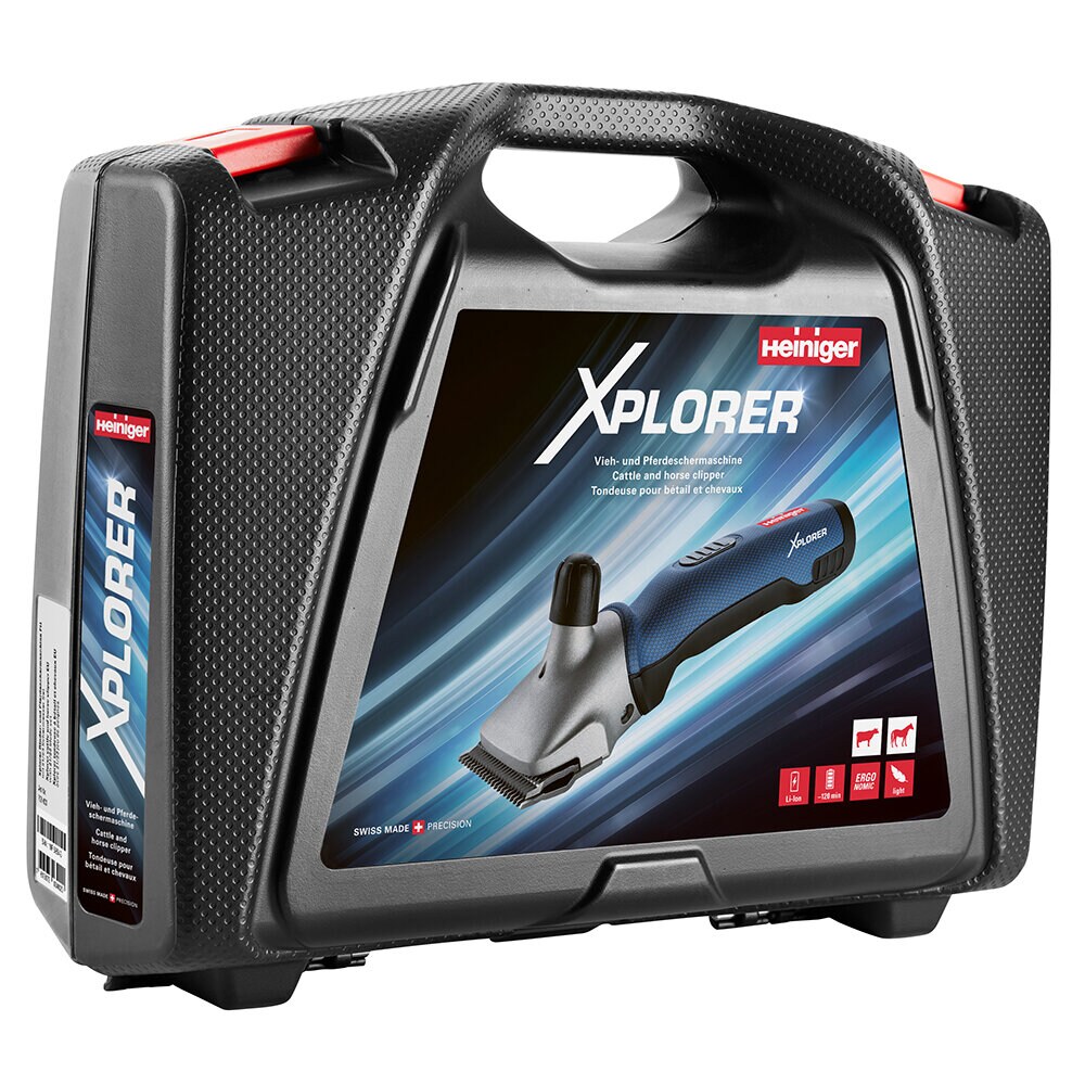 Heiniger Xplorer är en batteridriven, sladdlös klippmaskin utvecklad för helklippning av hästar, nötkreatur och andra större djur. Den kombinerar kraftfull prestanda med flexibilitet och ergonomi, vilket gör den idealisk både för dig som klipper större djur regelbundet och för dig som vill kunna röra dig fritt utan sladdar vid klippning.