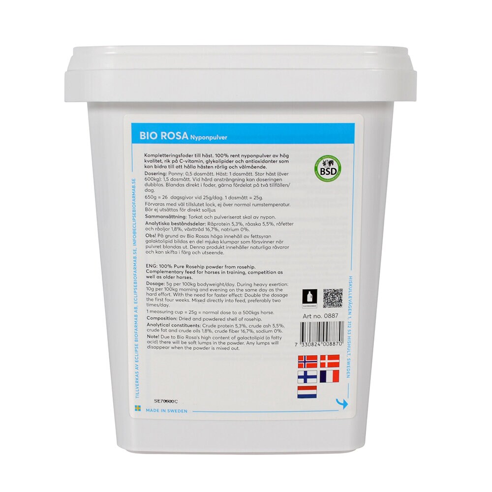 100% rent nyponpulver från bergsnypon av livsmedelskvalitet. Ett tillskott för den tränande, tävlande samt äldre hästen. Rikt på C-vitamin, galaktolipider och antioxidanter som hjälper till att hålla hästen frisk! De olika komponenterna har var för sig goda egenskaper som samverkar för en generellt bättre hälsostatus.