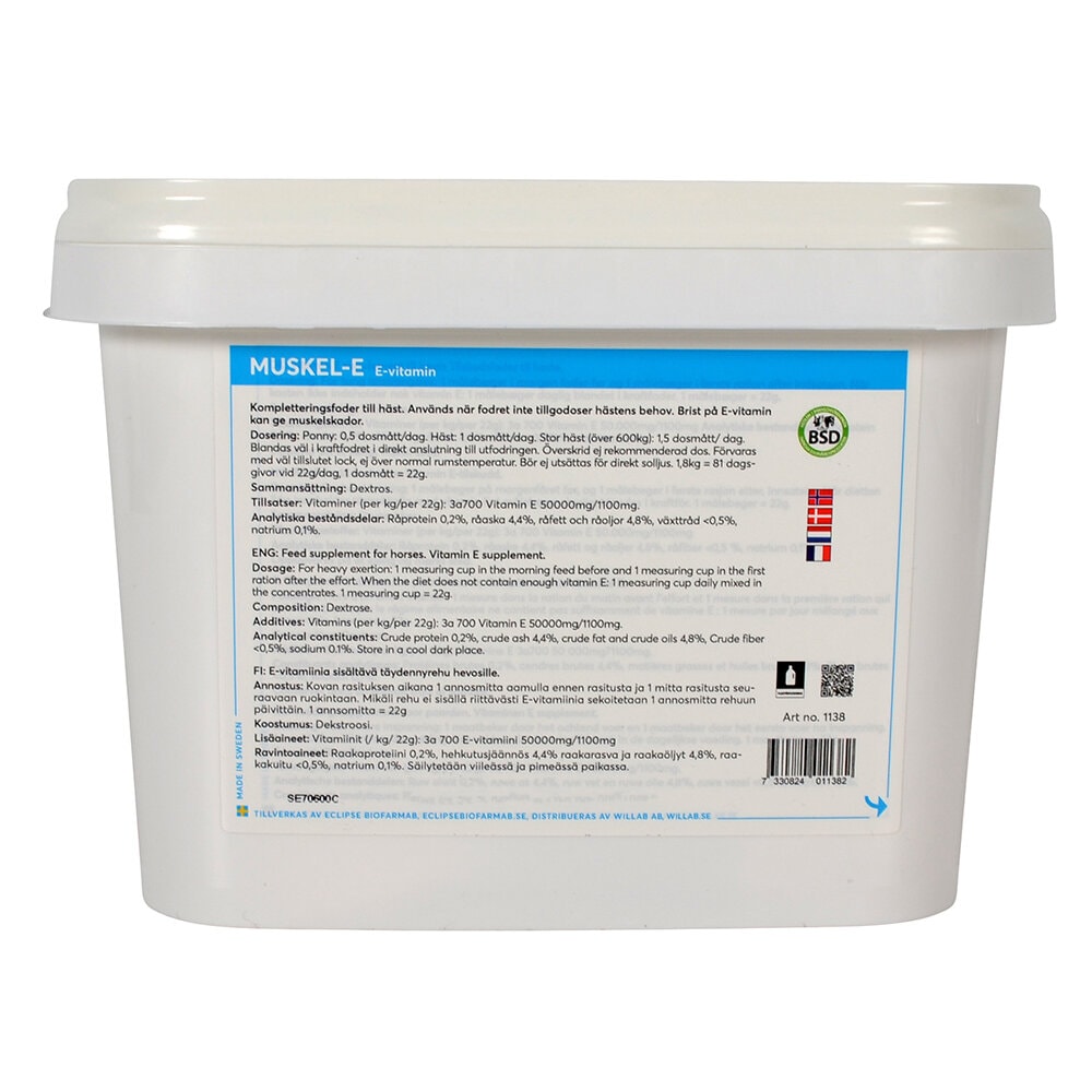 Denna produkt är märkt med BSD (Branschorganisationen Svenska Djurvårdsprodukter). Märkningen garanterar att produkten uppfyller svensk lagstiftning, samt regler och krav gällande produktmärkning. Detta säkerställer även att produkten är registrerad hos relevanta svenska myndigheter. Om produkten omfattas av tävlingskarens enligt karenstids- och förbudslista från Svensk Travsport, Svensk Galopp och Svenska Ridsportsförbundet, är detta tydligt märkt på produkten.