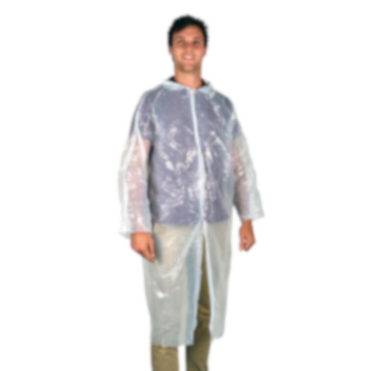 Engångs besöksrock av genomskinlig plast med trycklås fram. Längd 120 cm. Förpackning 50 st.