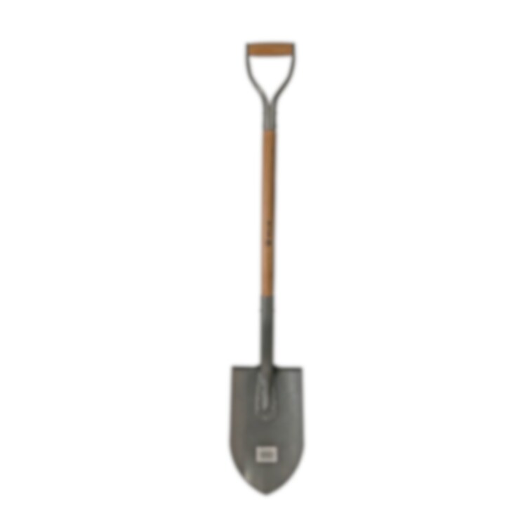 Grafitgrått spetsigt blad i stål, träskaft i ask och D-handtag i stål och trä. Bladets tjocklek 1,7 mm, skaftets Ø 37 mm, total längd 1120 mm.