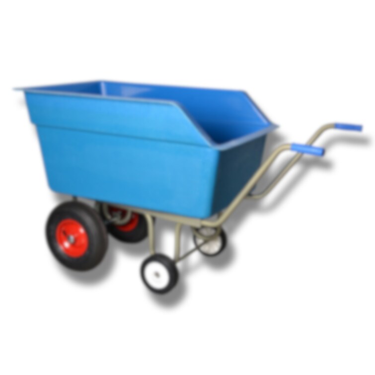 Med ett, alternativt två, luftgummihjul och två massiva hjul. Tillverkad i glasfiberarmerad plast.