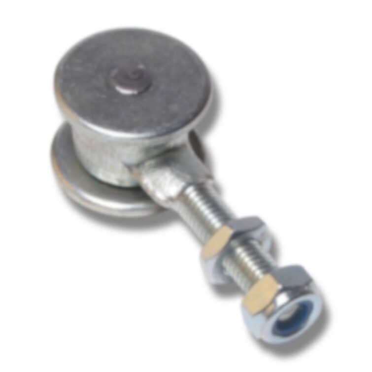 Hängrulle för skjutdörrar eller andra transporter som ska genom kurvor. Stålhjul. Passar till skena 290. Infästningsbulten är 10x30 mm.