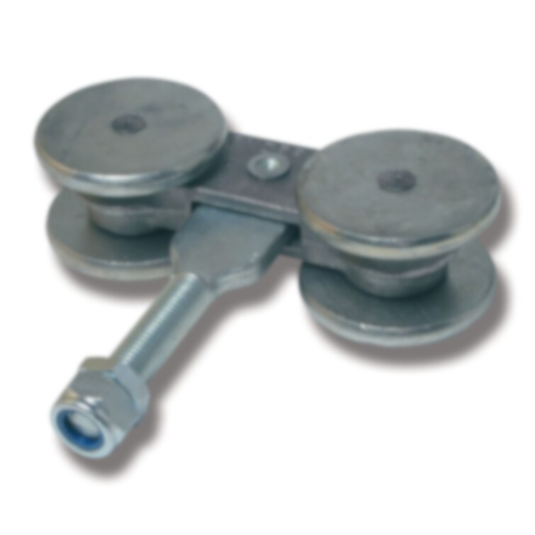 Hängrulle för skjutport med metallram. Permanent smorda kullager. Stålhjul. Passar till skena 307. Infästningsbulten är 20x86 mm.