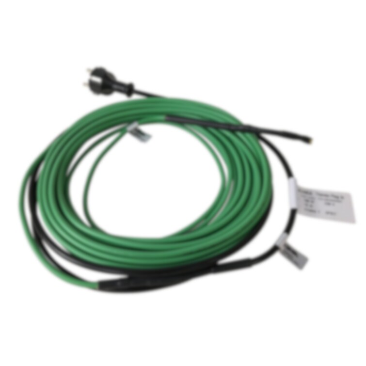 Värmekabel med effekt på 10 W/m avsedd för 230V med inbyggd termostat i kabeländen som förhindrar överhettning.