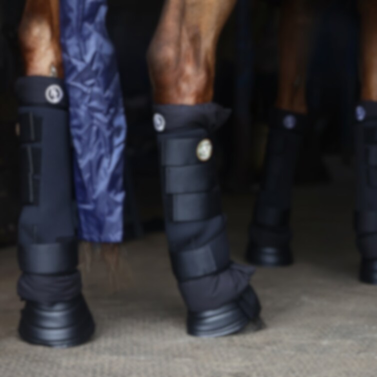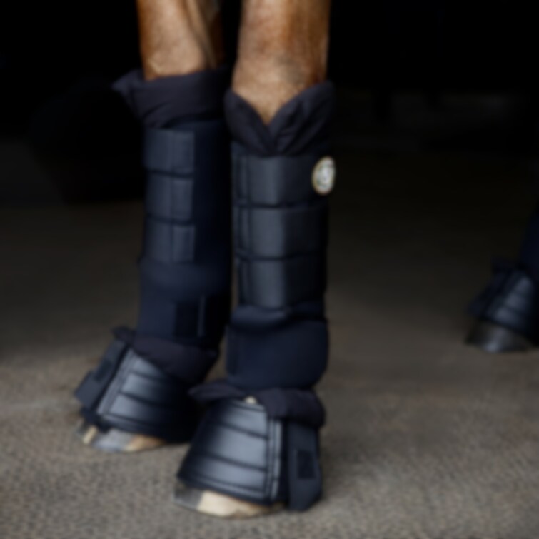 Stall/transportskydd i ett. Försluts med kraftiga kardborreförslutningar. 100% polyester. Säljes i par.