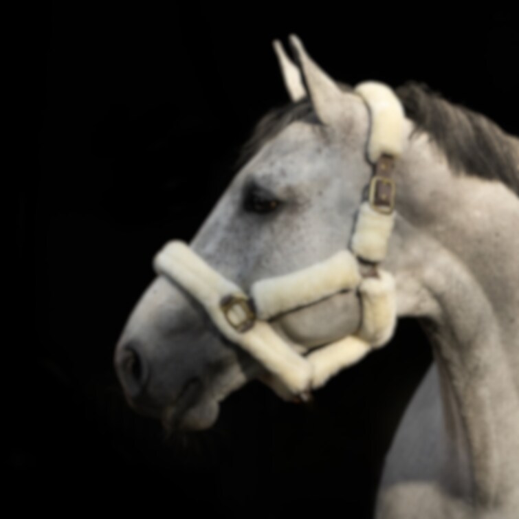 HS Faux fur grimma. Tillverkad av kraftig textil, klädd med mjuk syntetpäls. Reglerbar med mässingsfärgade beslag. Perfekt luddgrimma som ger din häst optimal komfort.