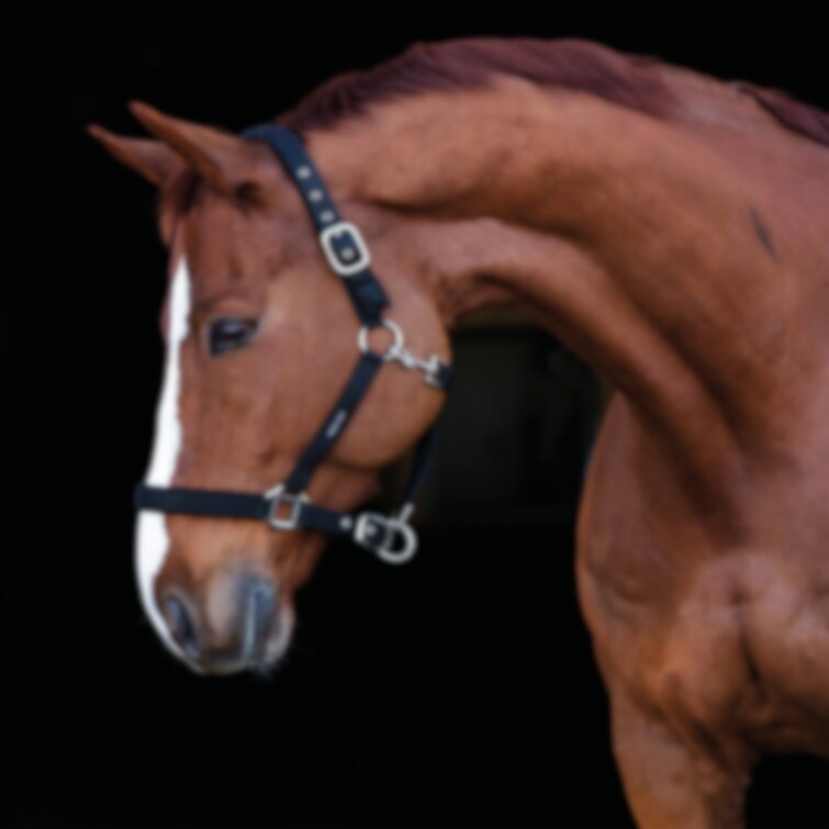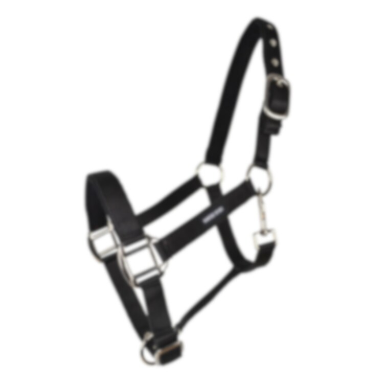 En rejäl grimma i nylon med mjuk frottéfodring - dessutom i stort urval av storlekar. Grimman är ställbar i både nos- och nackrem. Stål med beläggning av nickel.