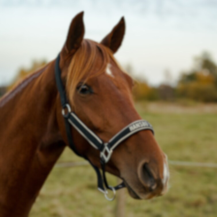 Stilfull och funktionell grimma med reflexdetaljer. Kraftig neoprenvaddering för att förhindra tryck och skav. Justerbart nosband och huvudstycke för optimal tillpassning.