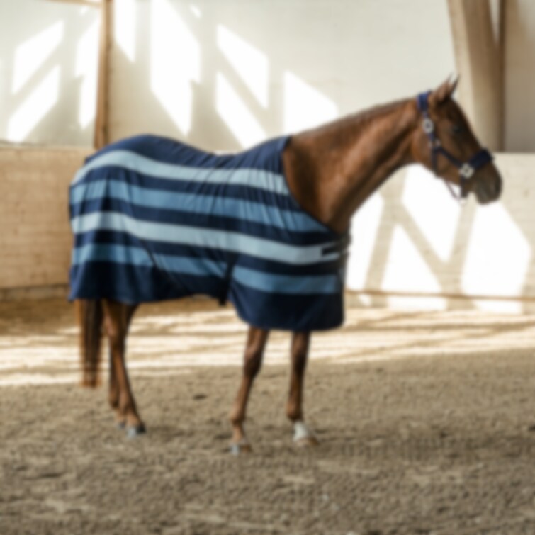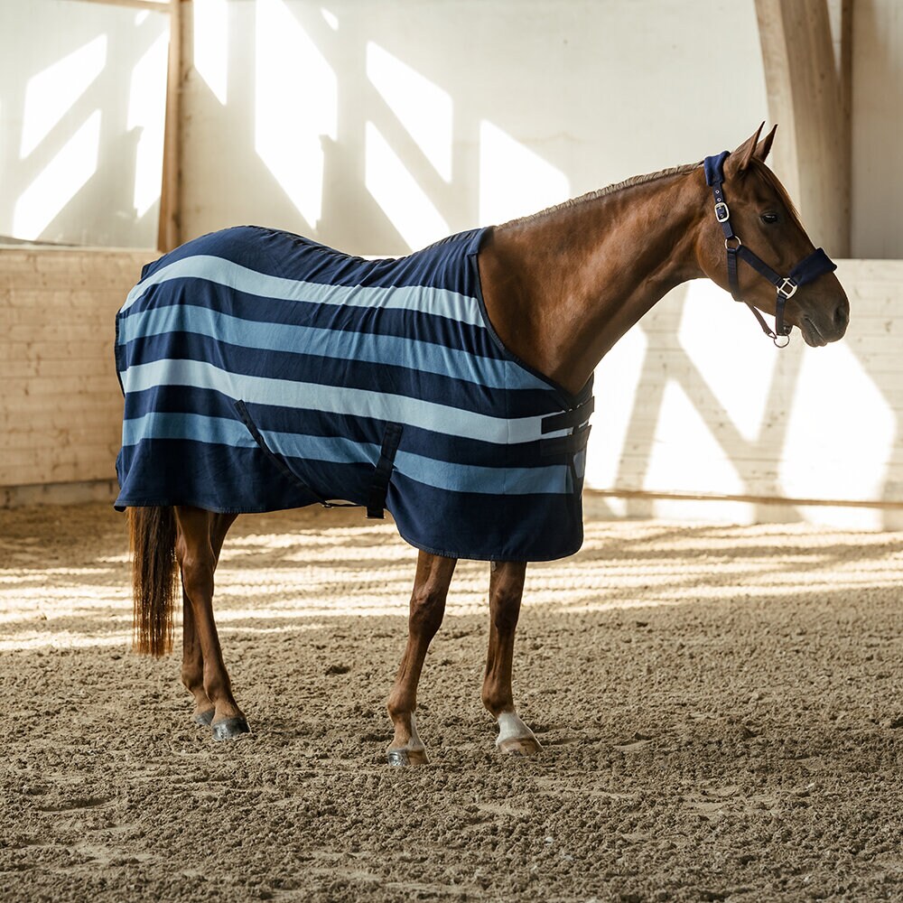 Fleecetäcke i kraftfull fleece med klassisk skärning, dekorerat med stilfulla ränder. Slät utsida, mjukt flossad fleece på insidan som transporterar bort fukten ifrån hästen och lägger det på utsidan av täcket. Perfekt att ha i stallet eller som transporttäcke. Designat med dubbla dolda spännen framtill för att förhindra att hästen fastnar i exempelvis hönät. Även försett med kryssgjordar och svansrem.