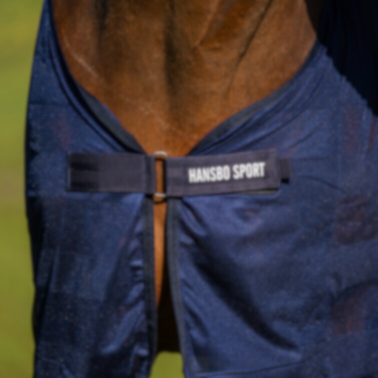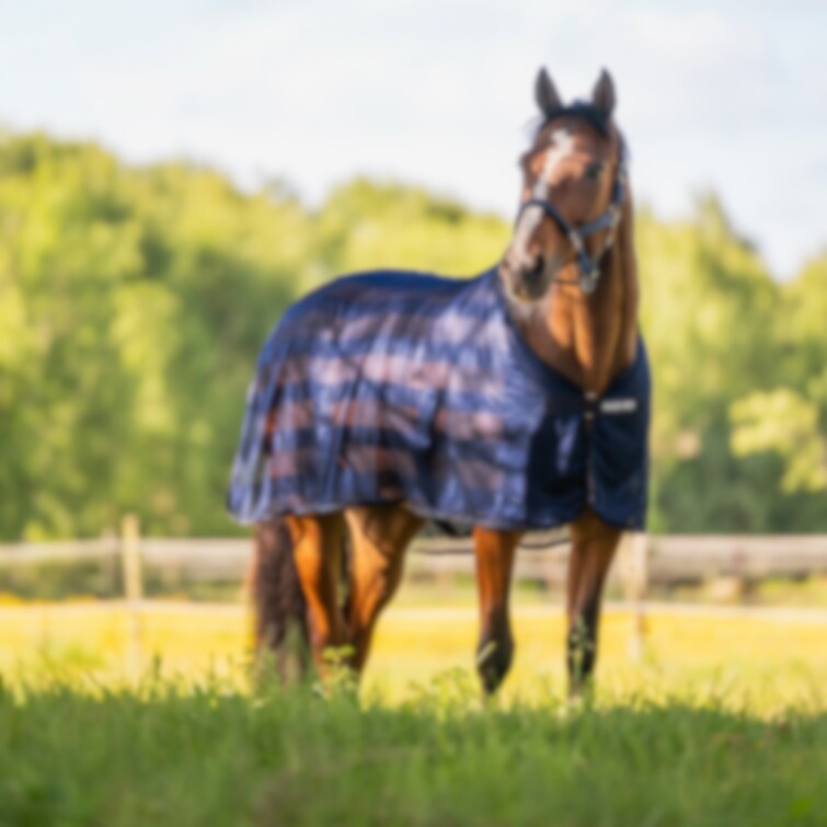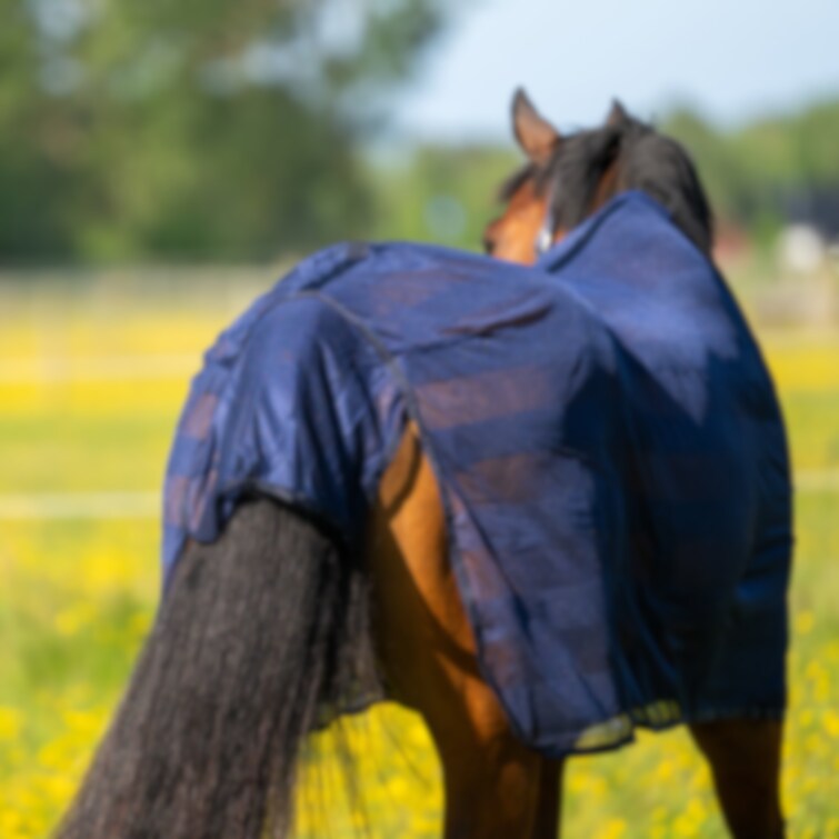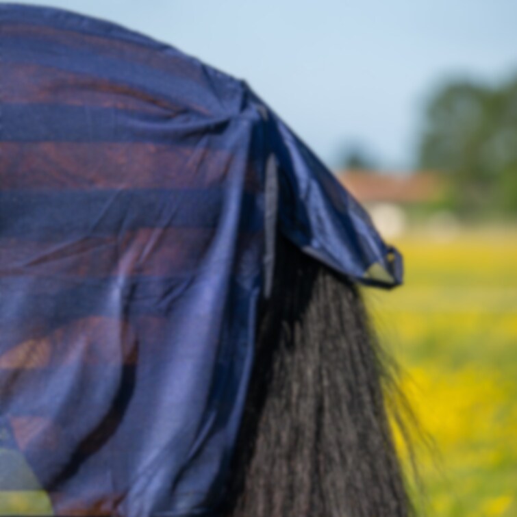 Klassiskt flugtäcke / nättäcke i mesh som effektivt skyddar mot irriterande insekter. Invävda ton i ton färgade, vertikala ränder. Designat med justerbara kryssgjordar, svansskydd, svansrem samt enkelt frontspänne.