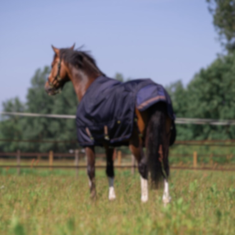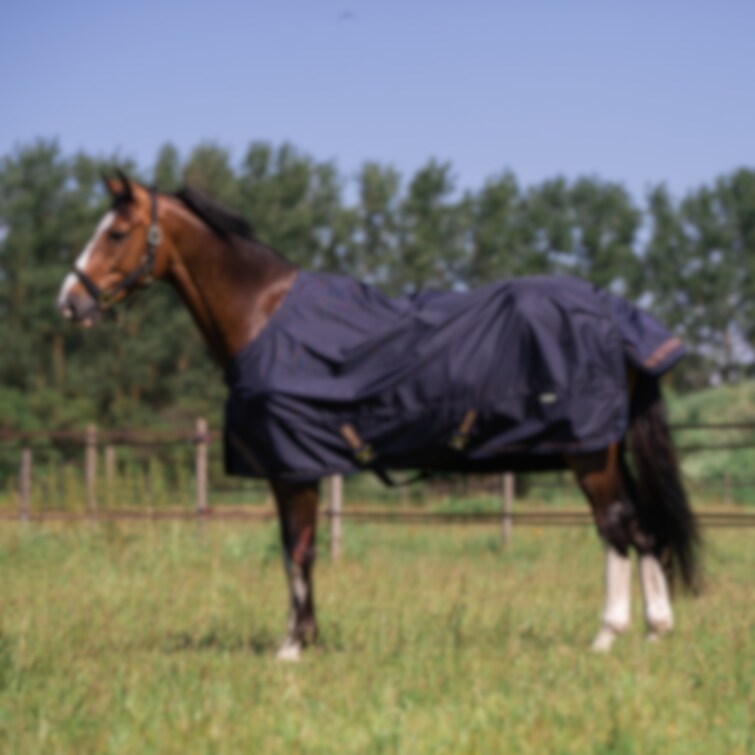 Regntäcke i 1200 D ballistik polyester. Vattentäthet och andbarhet > 5000. 70 D polyesterfoder. Låga kryssgjordar med dold elasticitet och gummiring. Dolda fästen för halstäcke. Kryssbelagda frontspännen för optimal passform.