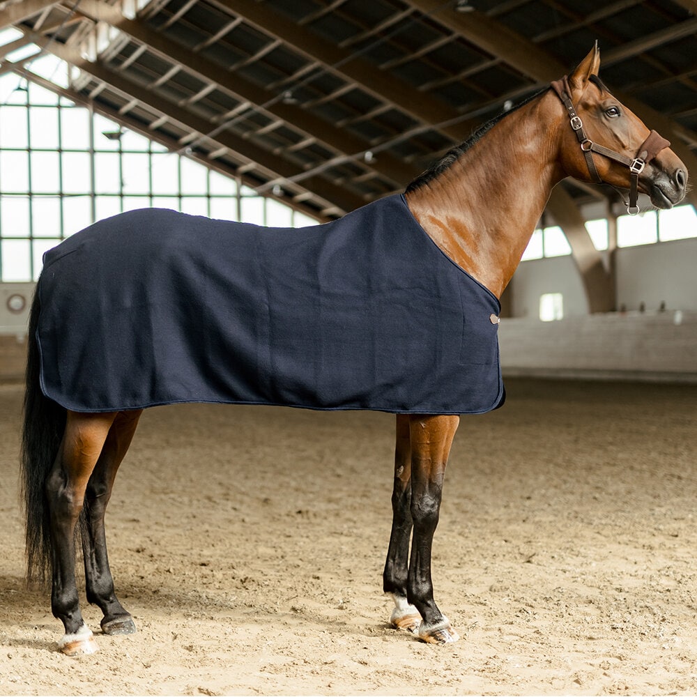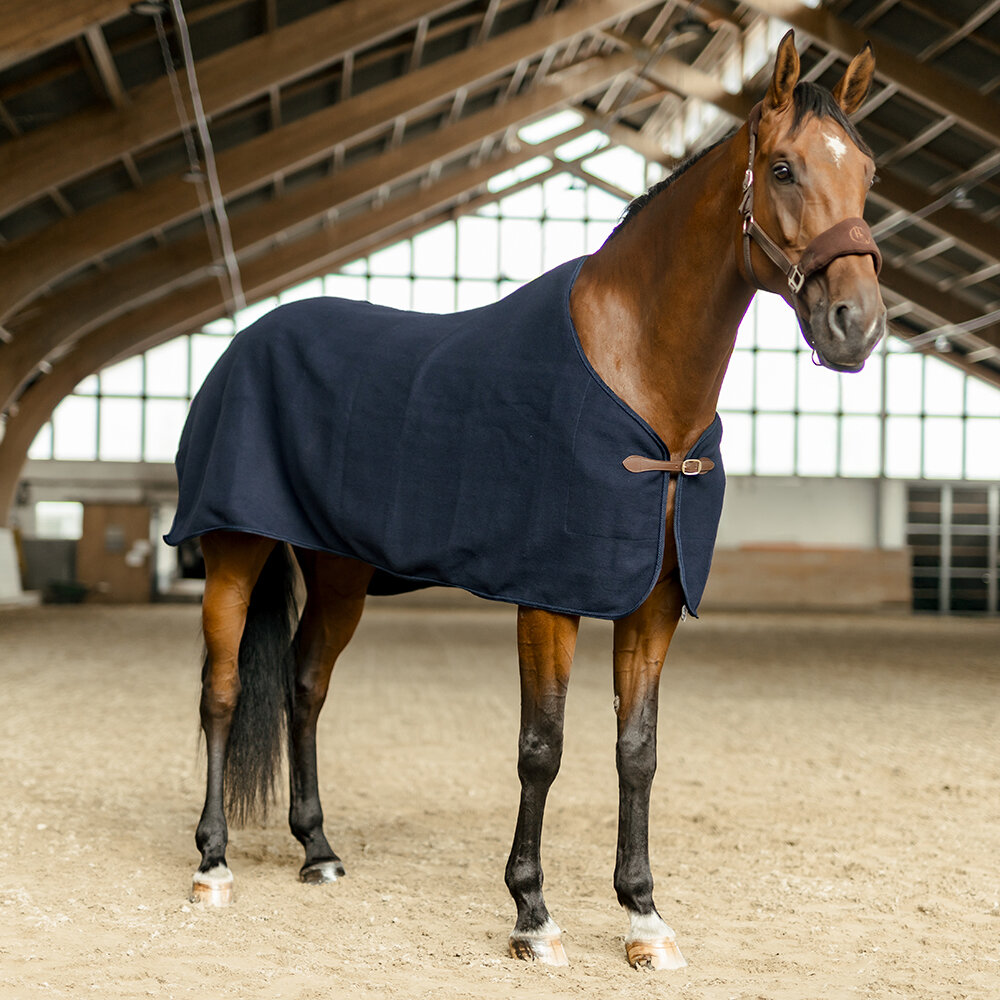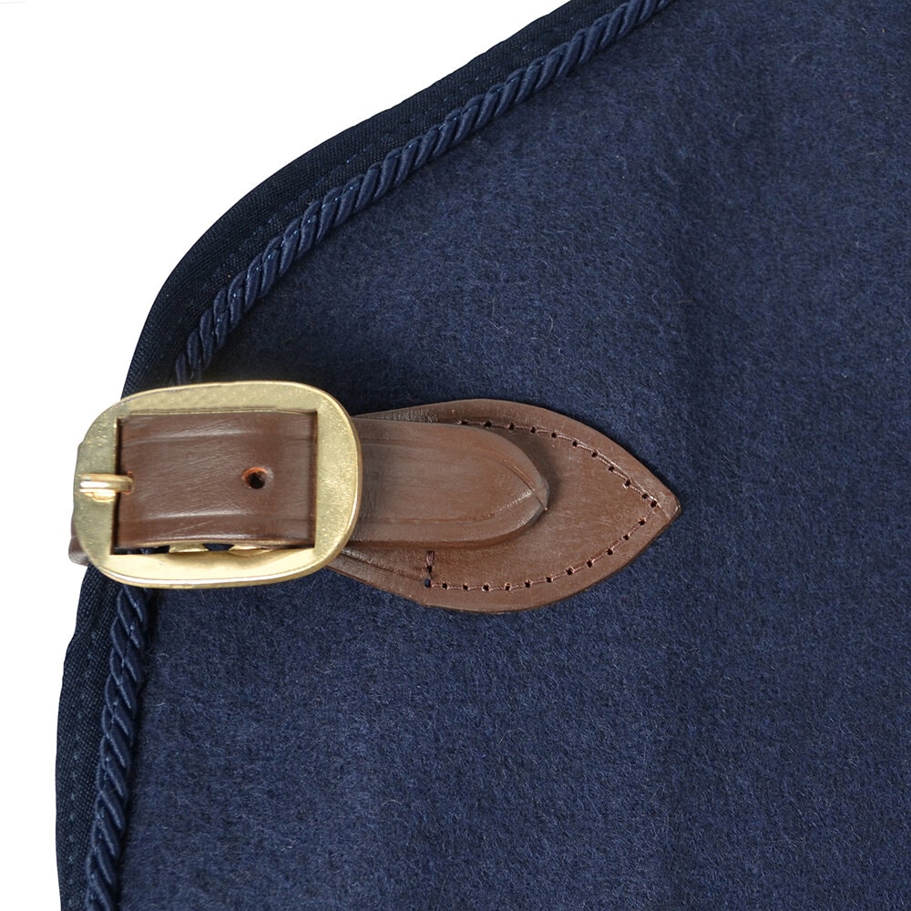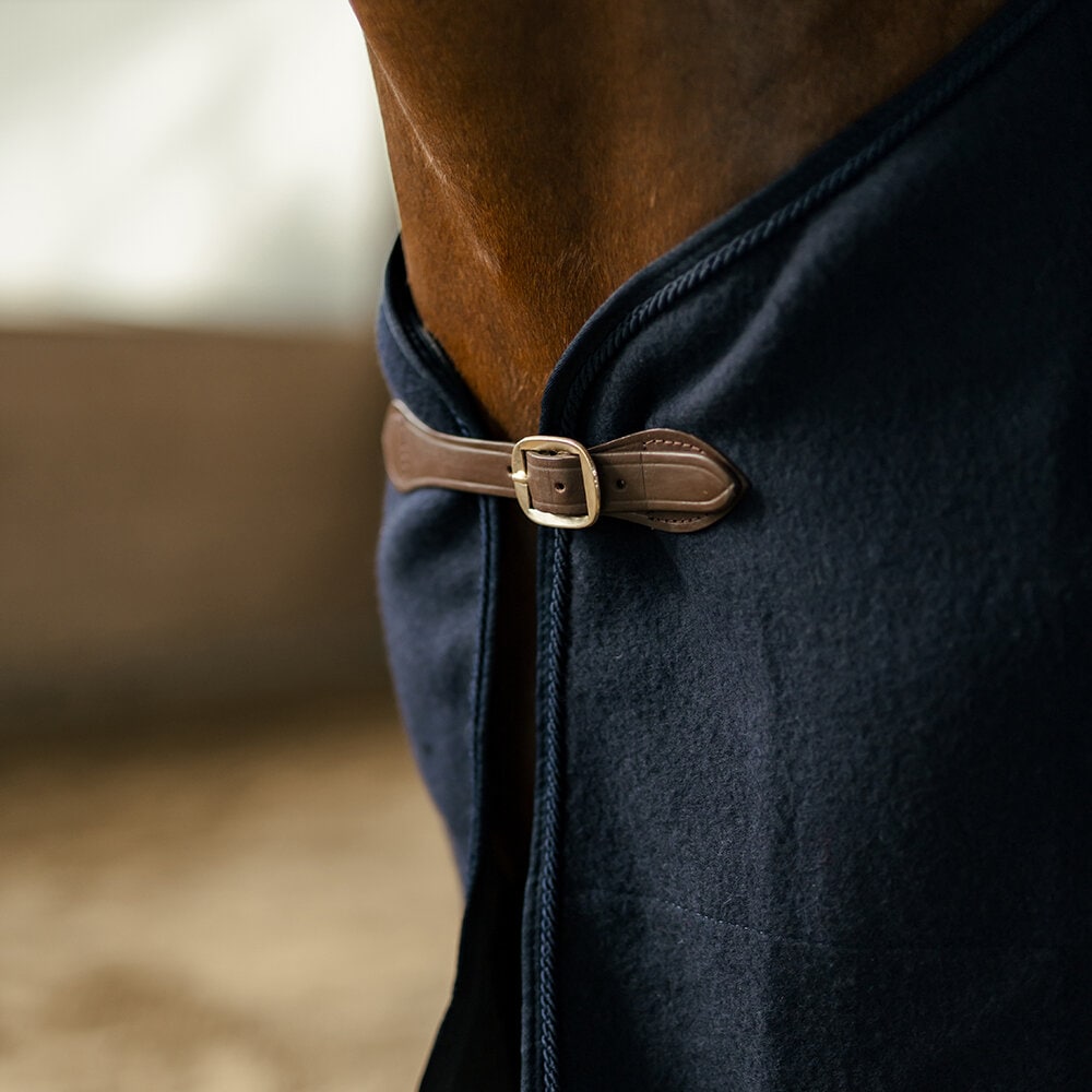 Täcke i kraftig ullblanding som håller hästen varm och torr, designat med dekorativ matchande passpoal. Avtagbara kryssgjordar samt vacker frontknäppning i läder. Optimalt för användning under framridning, efter träning eller som transporttäcke. Plats för egen brodyr. 80% ull, 20 % övriga textilfibrer, 650 GSM.