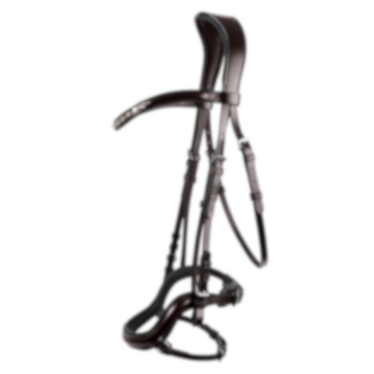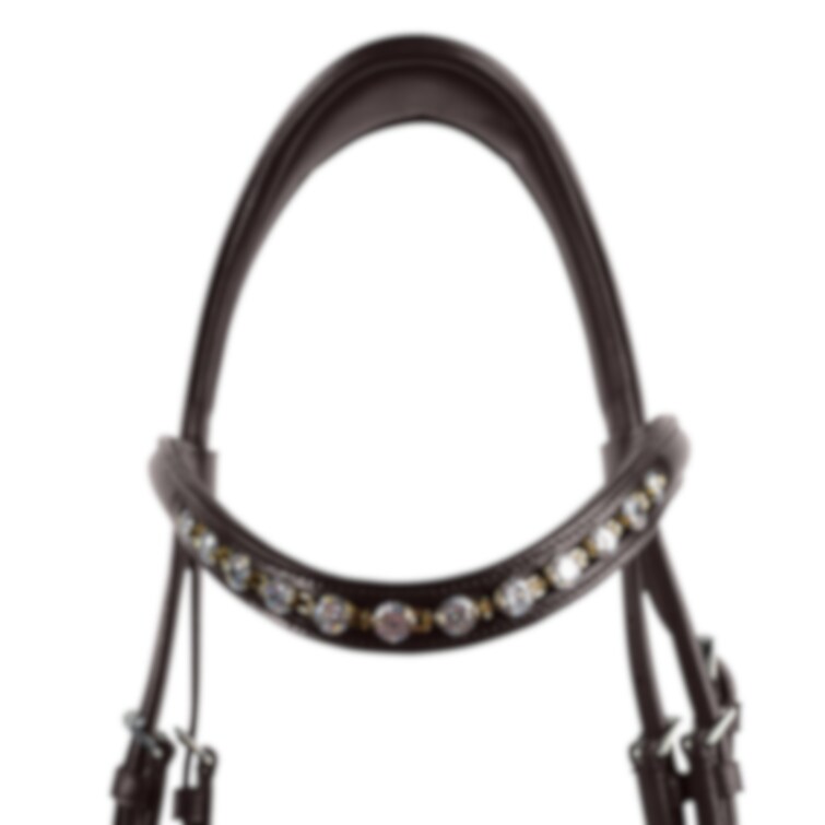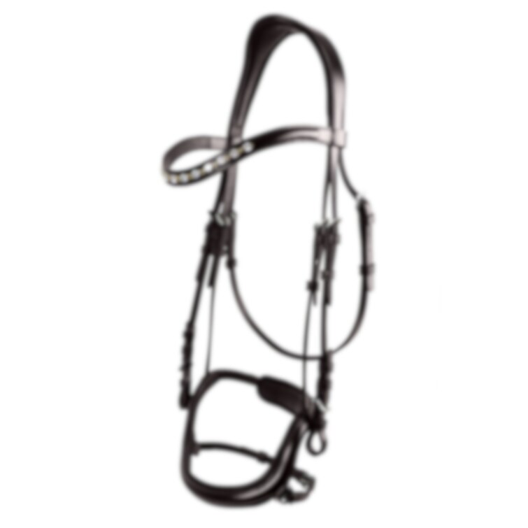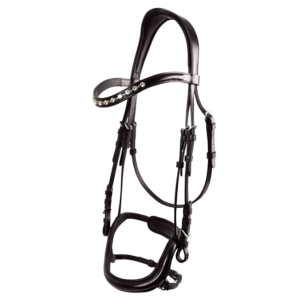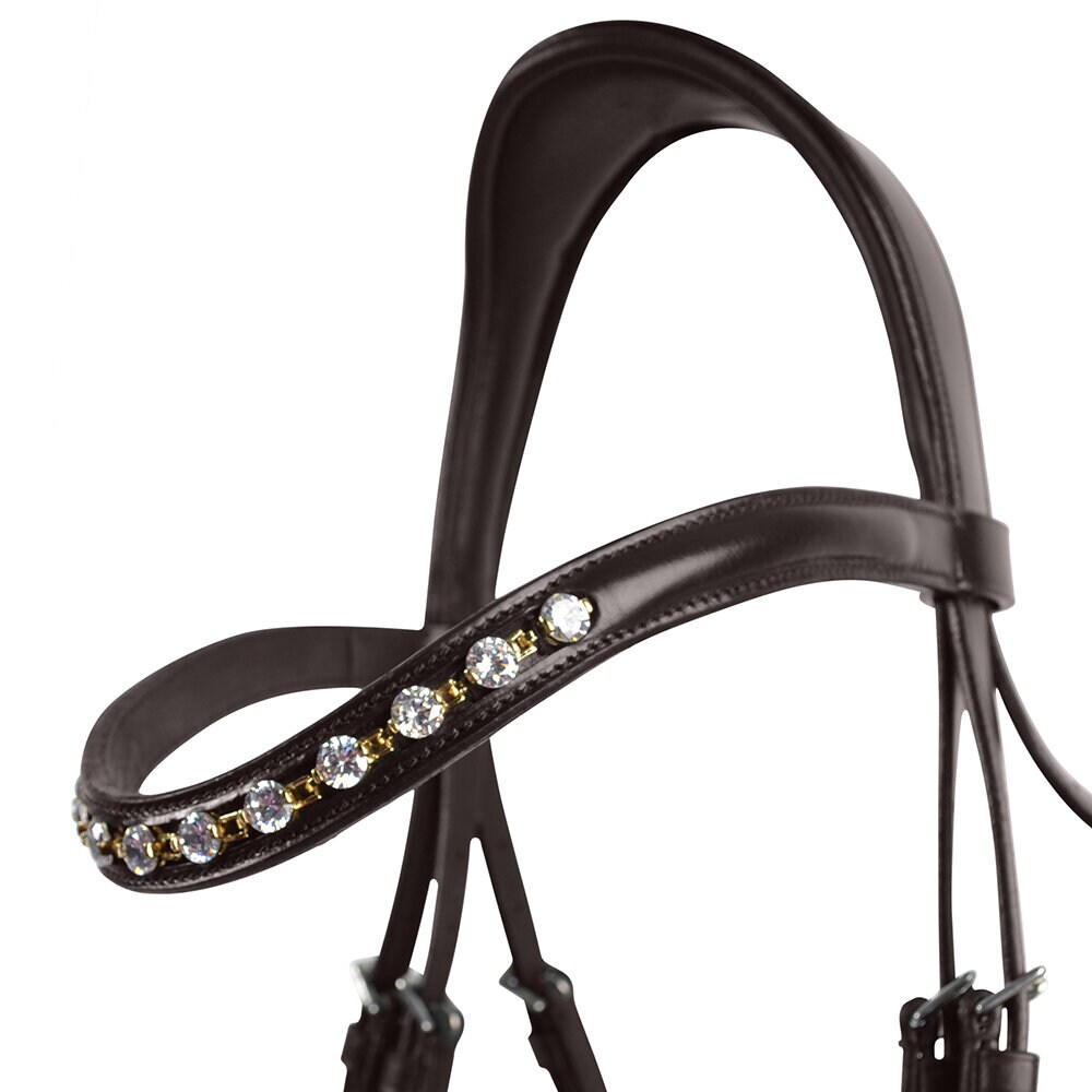 Välarbetat elegant träns med ergonomiskt utformat nackstycke och svängd nosgrimma. Tillverkat av högkvalitativt vegetabiliskt garvat läder, med mjuk vaddering vid nosgrimma, pannband och nackstycke. Vackert strassbandband med blandade metaller och silverfärgade dekorativa spännen. Säljes utan tyglar.