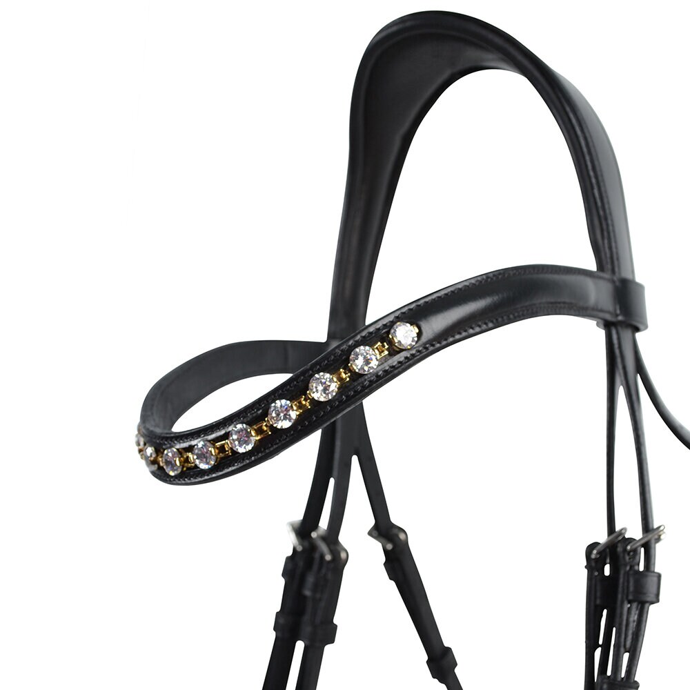 Välarbetat elegant träns med ergonomiskt utformat nackstycke och svängd nosgrimma. Tillverkat av högkvalitativt vegetabiliskt garvat läder, med mjuk vaddering vid nosgrimma, pannband och nackstycke. Vackert strassbandband med blandade metaller och silverfärgade dekorativa spännen. Säljes utan tyglar.