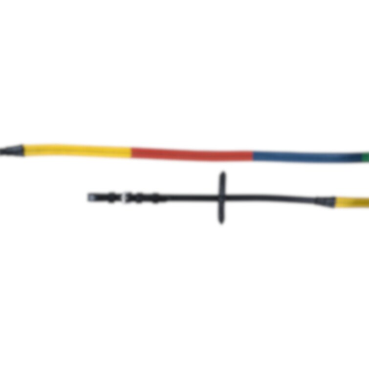 Gummitygel med färgade fält, lämplig för tex ridskolor. Nylon inuti gummit gör tygeln väldigt smidig. Läderdelen är 12 mm och gummidelen 18 mm bred. Svart läder, stålspännen.Totallängd ca 270cm