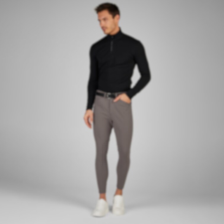 Byxan har klassiska snedfickor fram, ficklock med knapp bak samt något smalare bälteshällor för en stilren siluett. Pikeur-loggan finns diskret placerad på fram- och bakficka. Fåll i benslut ger en ren avslutning vid stöveln.