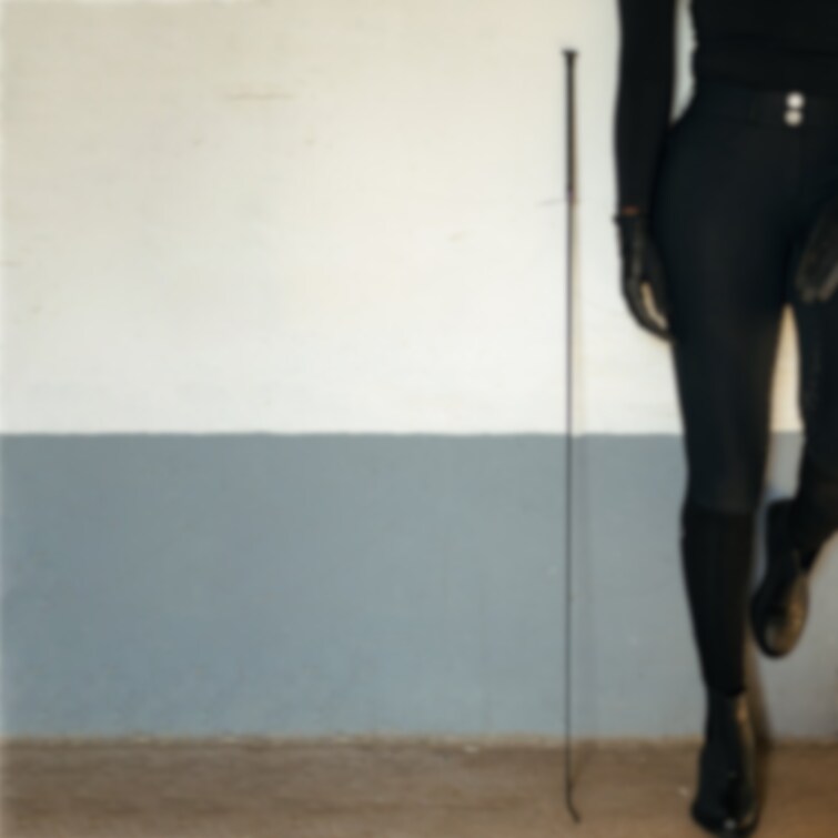 Ridspö i dressyrmodell, styvt med dekorativ svart knopp. Greppvänligt, mjukt handtag av konstläder och smal 10 cm lång klatsch. Noga utvald vikt, för optimal balans i spöet vid ridning.