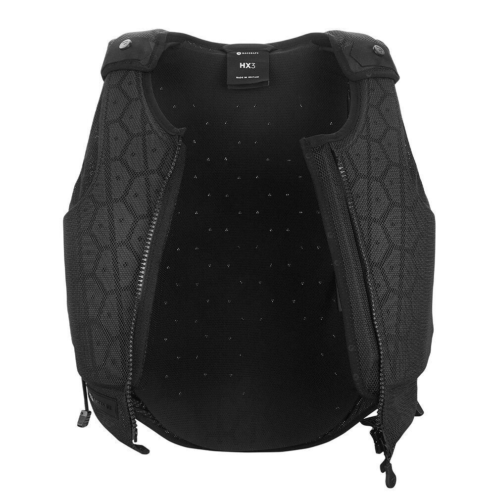 Säkerhetsväst från Racesafe med innovativ hexagonal design, avancerad andningsförmåga och flexibilitet i flera riktningar för optimal rörelse och komfort. Certifierad enligt BETA 2018 standard (nivå 3) och EN13158:2018.