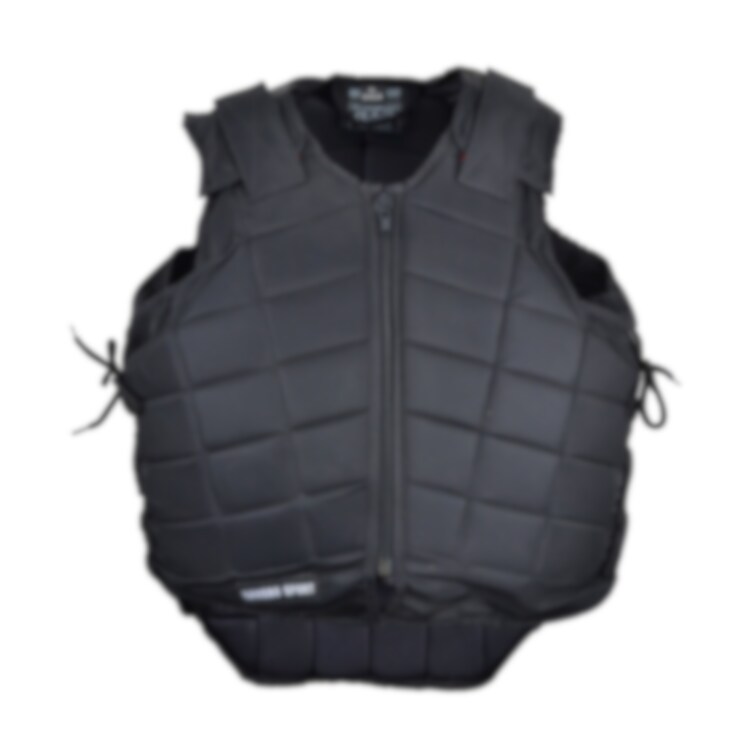 Säkerhetsväst med plattor. Snörning i sidorna. Dragkedja framtill. Kardborre vid axlarna. Yttermaterial i polyester, innermaterial i lycra. Instruktionslapp medföljer. Godkänt enl EN 13158:2009, klass 3. CEmärkt.