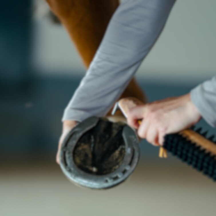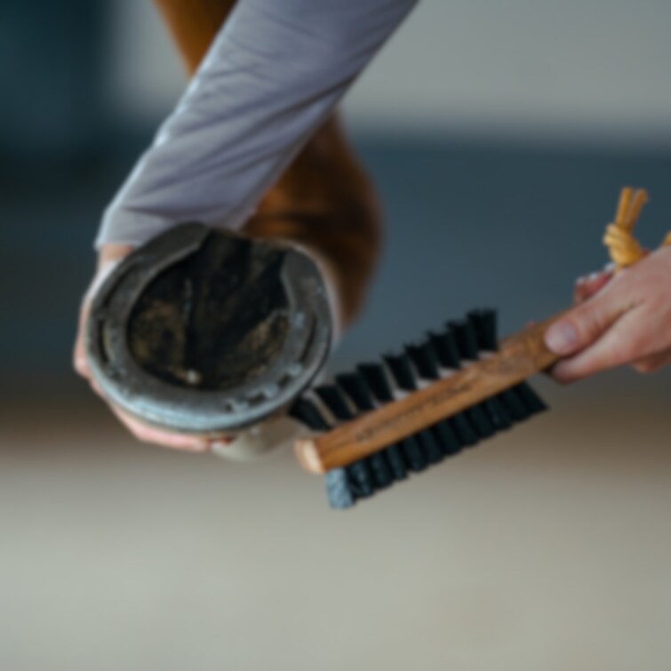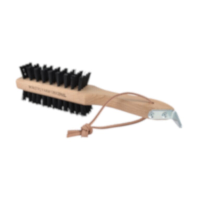 Multifunktionell borste med inbyggd hovkrats. Designad med ett trähandtag av bokträ, borst av polypropen, PP-fiber samt en greppvänlig läderrem.