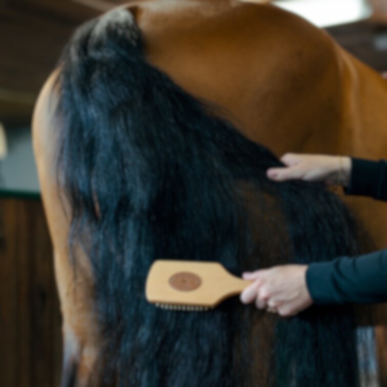 Borste för man och svans.Tillverkad av lövträ, rem av läder samt gummiplatta som inte alstrar statisk elektricitet.