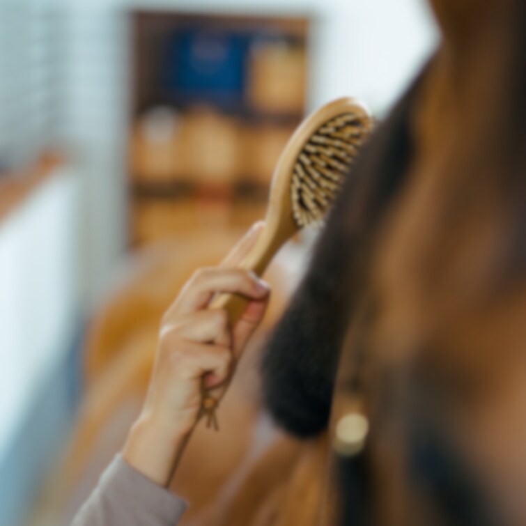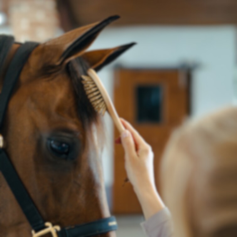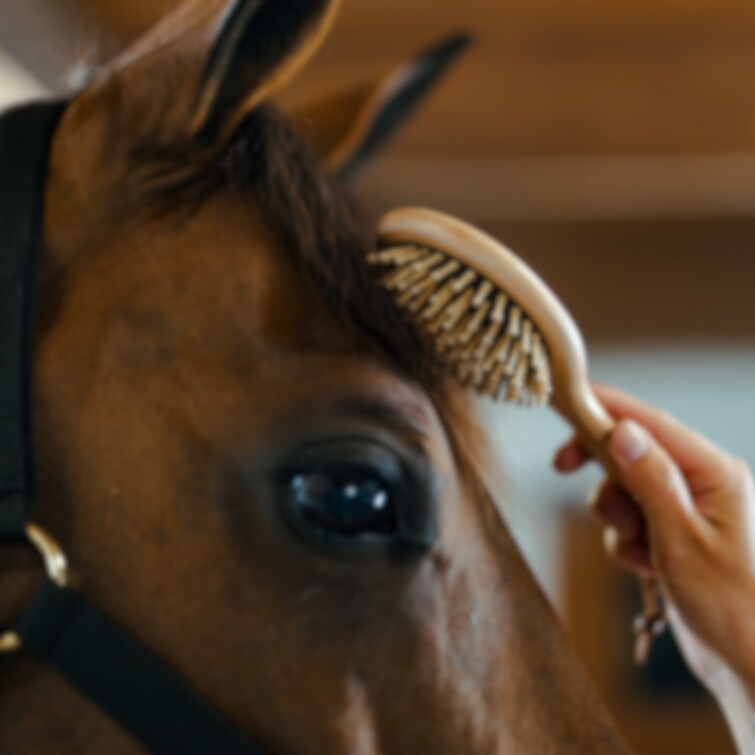 Rund massageborste, som med fördel även kan användas både till man och svans. Tillverkad av bokträ och designad med ett greppvänligt handtag samt en läderrem för upphängning.