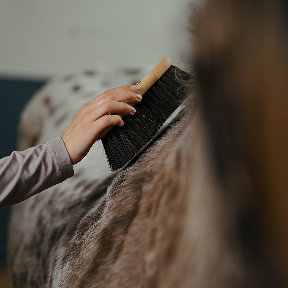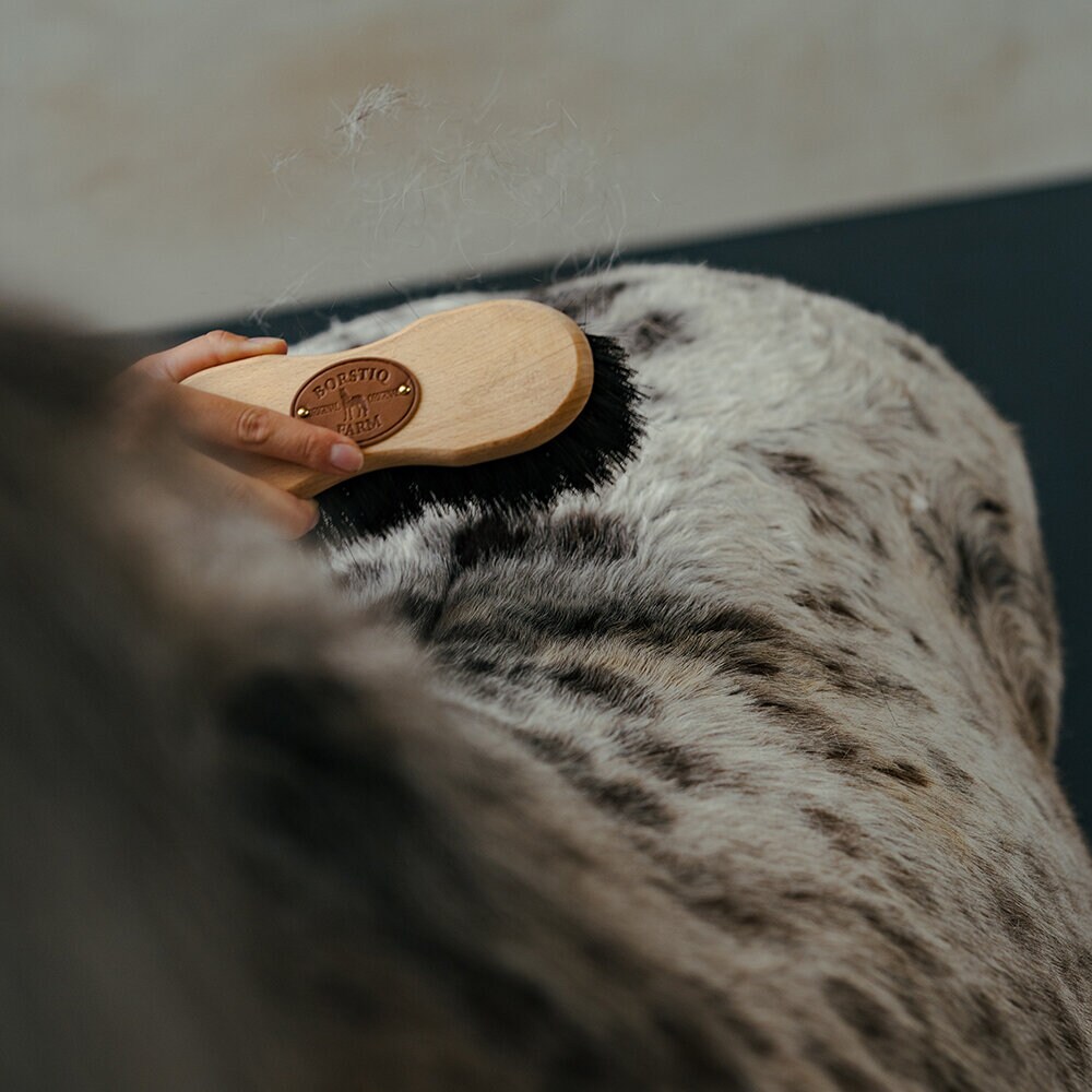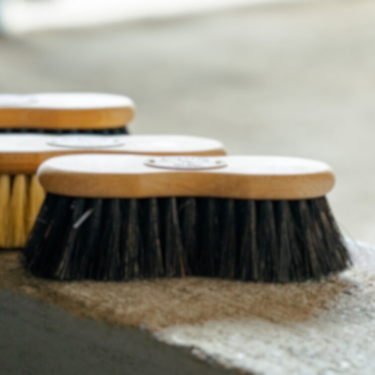 Greppvänlig, ergonomisk och smidig borste gjord av bokträ och med borst av Arenga Fiber. Medium hård borste designad för att snabbt ta bort torkad lera och smuts.