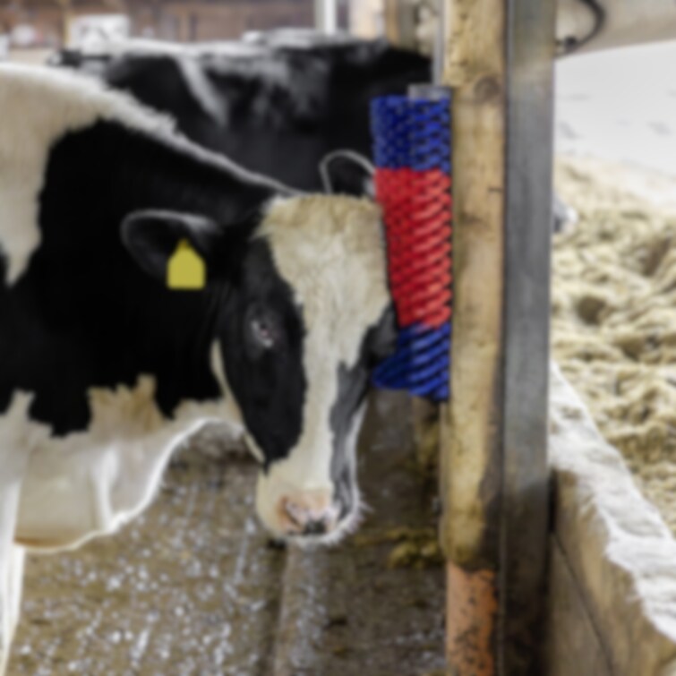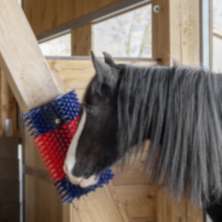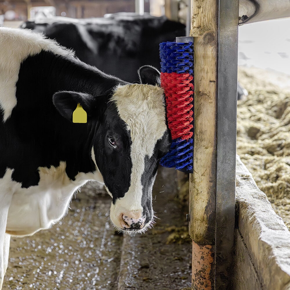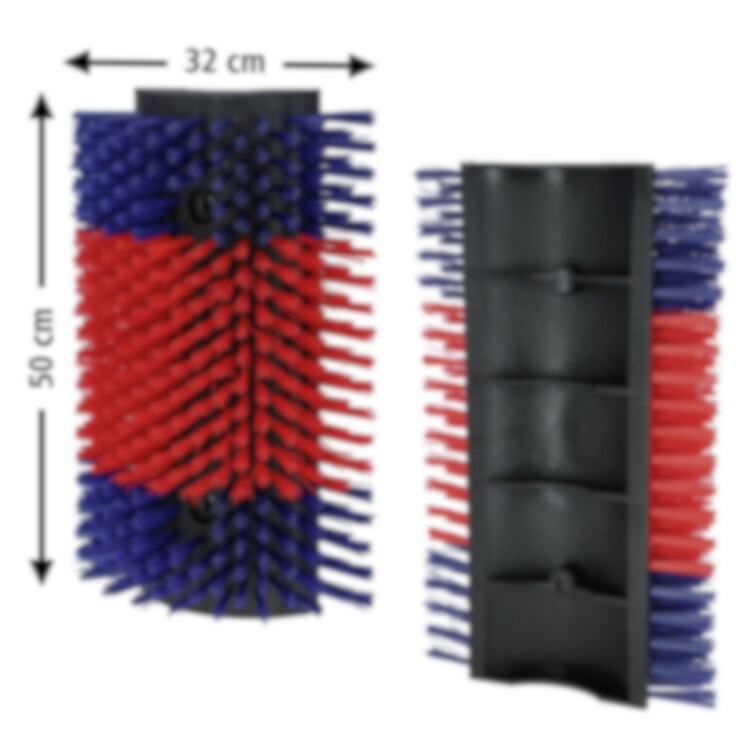Denna väggmonterade ryktborste är konstruerad för att möta behoven hos större djur i lösdriftsstallar och hagar. Borsten möjliggör för djuren att självständigt sköta sin päls, vilket bidrar till förbättrad hygien och välbefinnande.