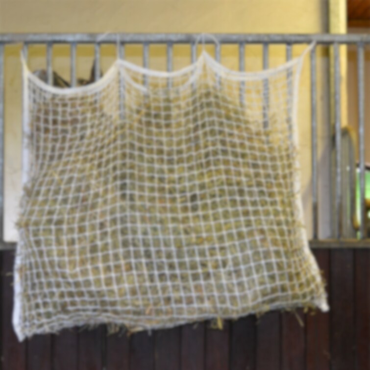 Finmaskigt nät att hänga upp. Passar bra för hästar som man vill ge längre ättid, då hålen är endast 3,5 cm. Tänk på att hänga på väl vald plats där hästen inte kan fastna i nätet.För en del hästar tar det tid att vänja sig att äta av småmaskiga nät. 100% terylene.Vitt med marin kant.