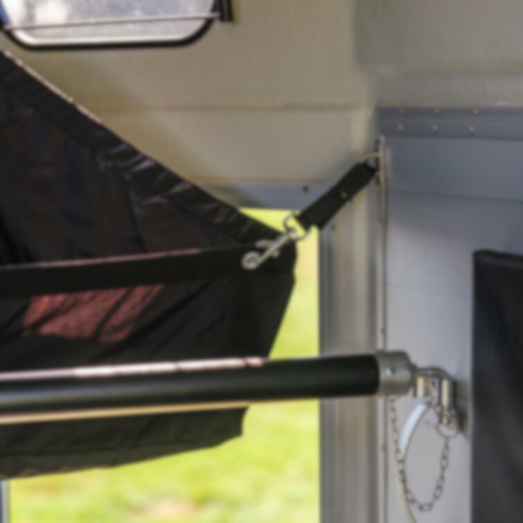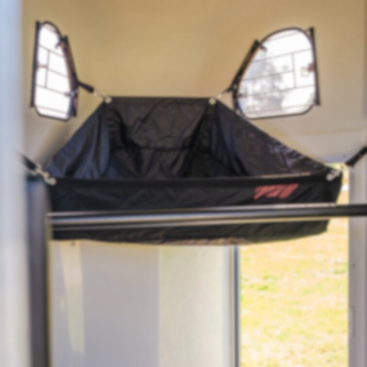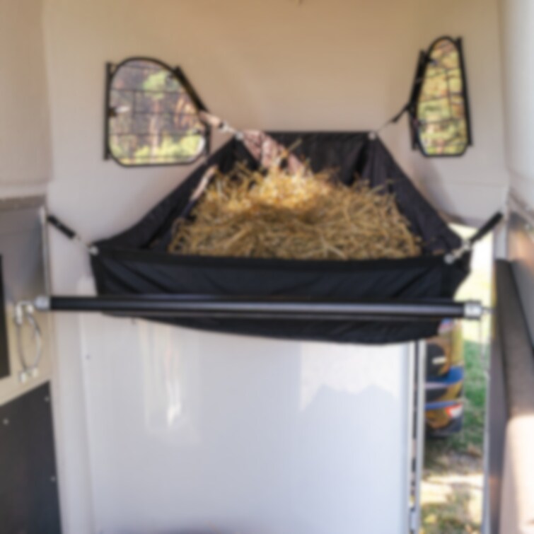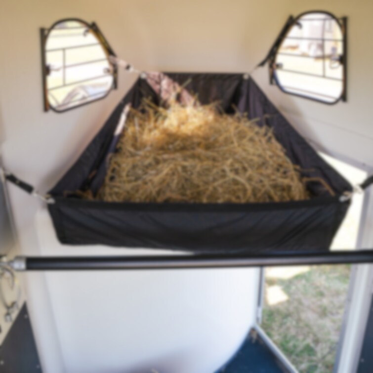 Funktionellt hösegel i trekantig modell, som passar både lastbil och hästtransport. Förstärkta hål med tillhörande hakar för upphängning. Djup ca 25 cm