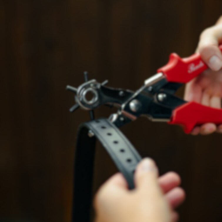 Handhållen håltång i metall med greppvänligt handtag. Optimal för håltagning i träns, stigläder, grimmor eller andra läderartiklar.