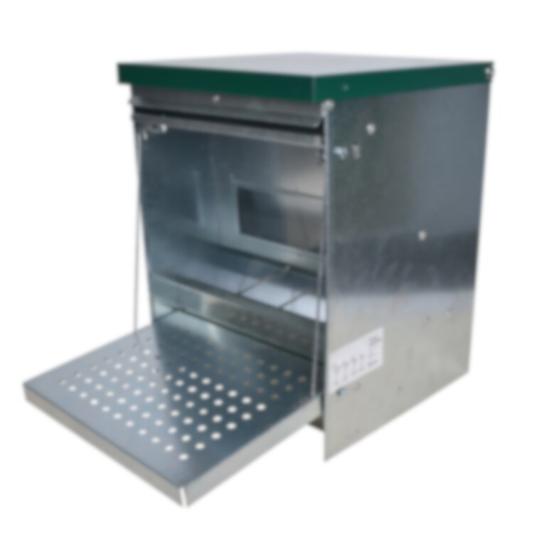 Foderautomat för hönsfåglar med pedalöppning tillverkad i metall. Fodret är bara åtkomligt när en fågel står på pedalen som öppnar luckan till fodret. Detta skyddar fodret mot yttermiljön och skadedjur. Belastningen som krävs för att öppna luckan är inställningsbar i tre steg och kan därmed anpassas efter fågelns vikt. Siktglas gör att man enkelt kan inspektera fodret. Påfyllning av foder sker enkelt genom lucka i foderautomatens topp.