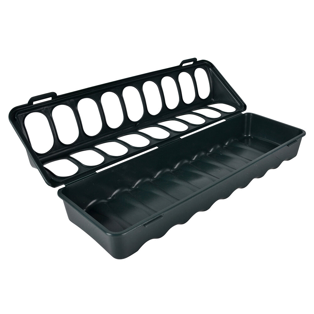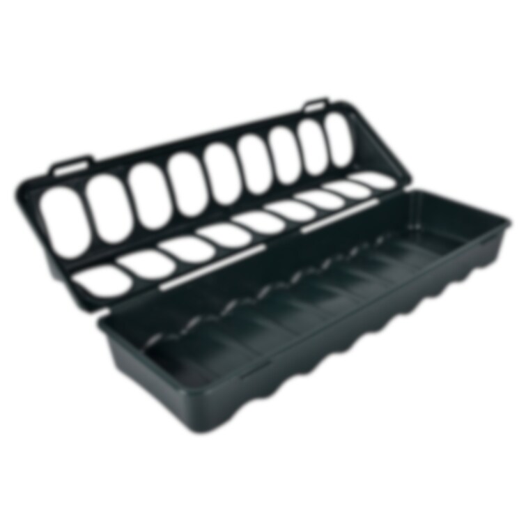 Fodertråg tillverkad i återvunnen plast. Lätt att hålla ren. L 305 x B 100 x H 70 mm.