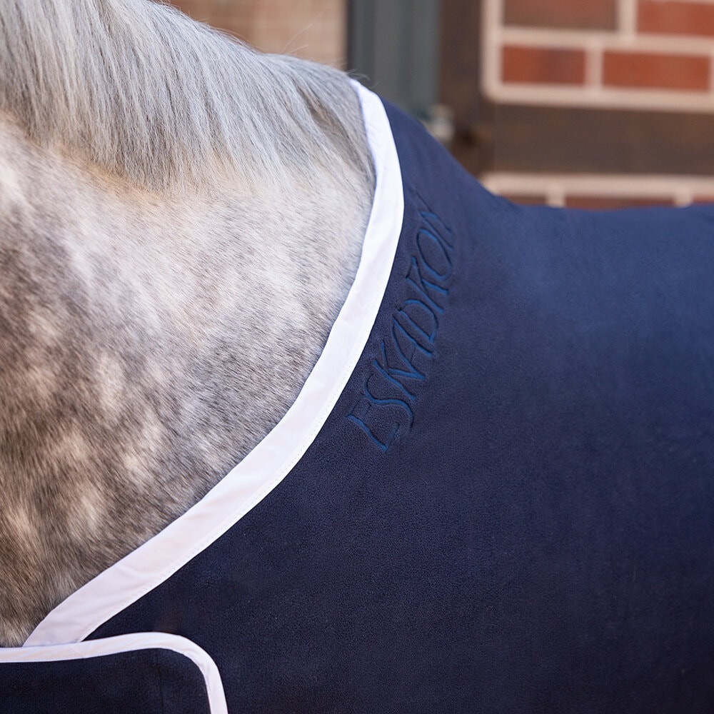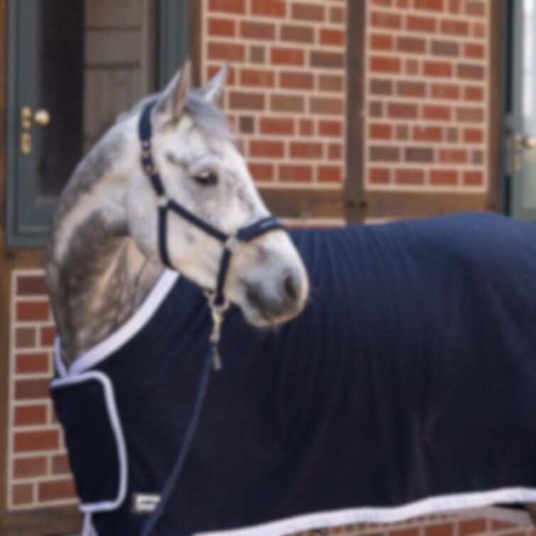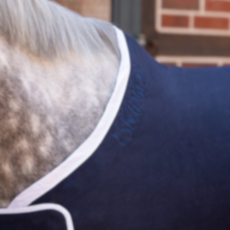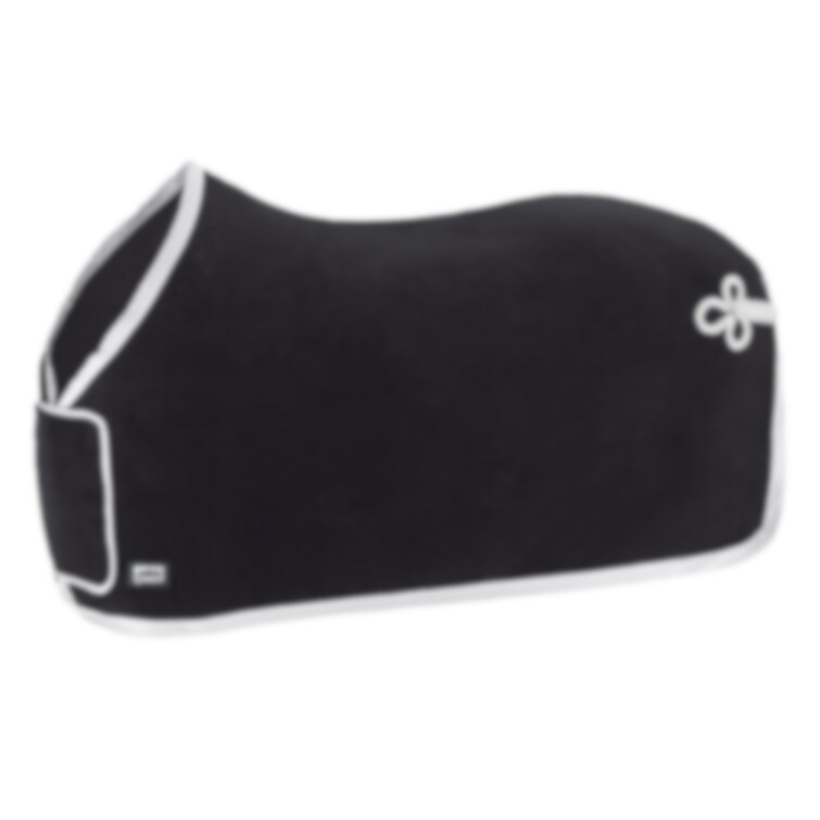 Fleecetäcke av hög kvalitet som inte noppar sig. Detaljerad med dubbla frontspännen, blankt kantband i kontrastfärg, brodyrplatta över frontspännena och en elegant svansrem.
